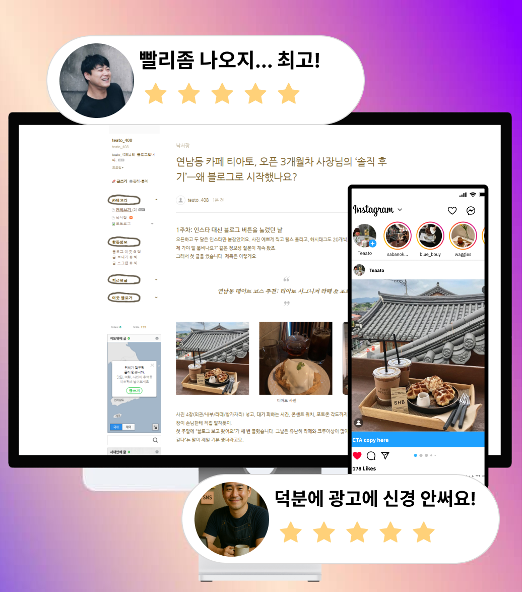 사장님의 가게 정보, 이미지를 기반으로 트렌드 분석을 통해 광고 컨텐츠가 자동 생성되며 클릭 한 번이면 사장님의 네이버 블로그·인스타 계정에 컨텐츠가 업데이트됩니다.